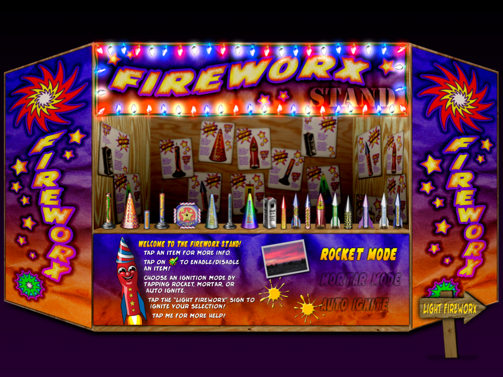 Fireworx Stand is realtime particle animations of fireworks, with realistic sparks, fire, smoke, and authentic sound effects!